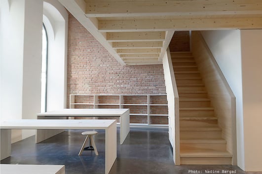 In einem leer stehenden Erdgeschosslokal am Augarten richteten Bereuter Architekten ihr eigenes Büro ein. Alle Räume wurden vollständig entkernt, die bestehende Galerie entlang der Fassade abgetragen, eine neue rückwärtig liegende Galerie eingezogen und die Wände in den hinteren Räumen mit Lehm verputzt. Die neuen Einbauten sind fast ausschließlich aus Holz in sehr hoher handwerklicher Ausführungsqualität. Die Holzarten wurden ihren Eigenschaften entsprechend eingesetzt: Fichte für die tragenden Bauteile, Weißtanne für die Täfelung der Wände und die Treppenwange, Braunkernesche für die Treppenstufen und den Fußbodenbelag sowie Ahorn für die Möbel. Alle Holzoberflächen sind naturbelassen. Sie wurden lediglich geschliffen oder sägerau belassen.