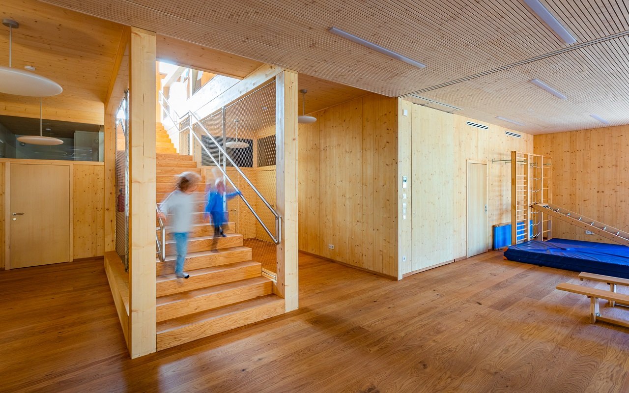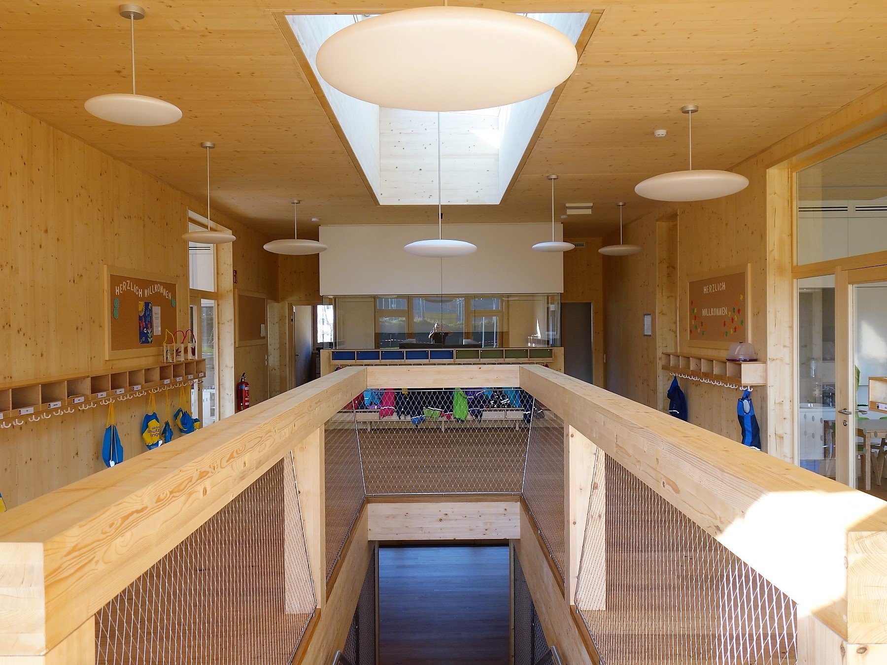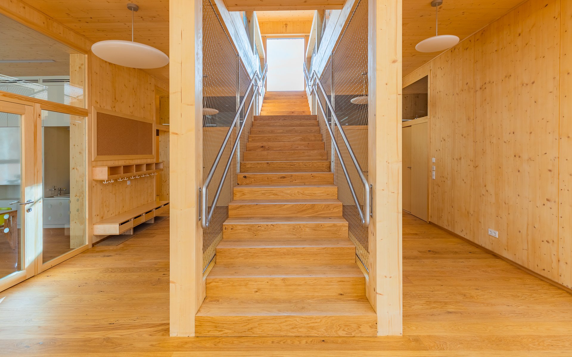 Die erdberührten Bauteile sind aus Stahlbeton, alle anderen Elemente sind konsequent aus sichtbaren Brettschichtholzplatten hergestellt. Es wurden 3 gleich breite Raumfelder von je 6m – mittig eine offene Treppe -drumherum die Garderoben mit Oberlicht ausgebildet. An den nicht auf Geländehöhe liegenden Gebäudeseiten werden linear die Nutzräume angeordnet. X Large Fenster und Glastüren/Elemente lassen den umgebenden Naturraum ins Innere + optimale innere Durchlässigkeit zu.