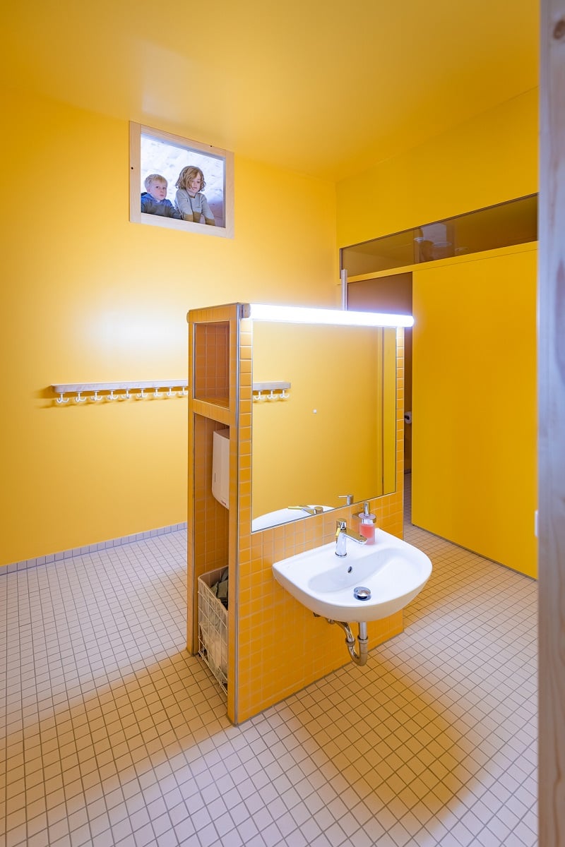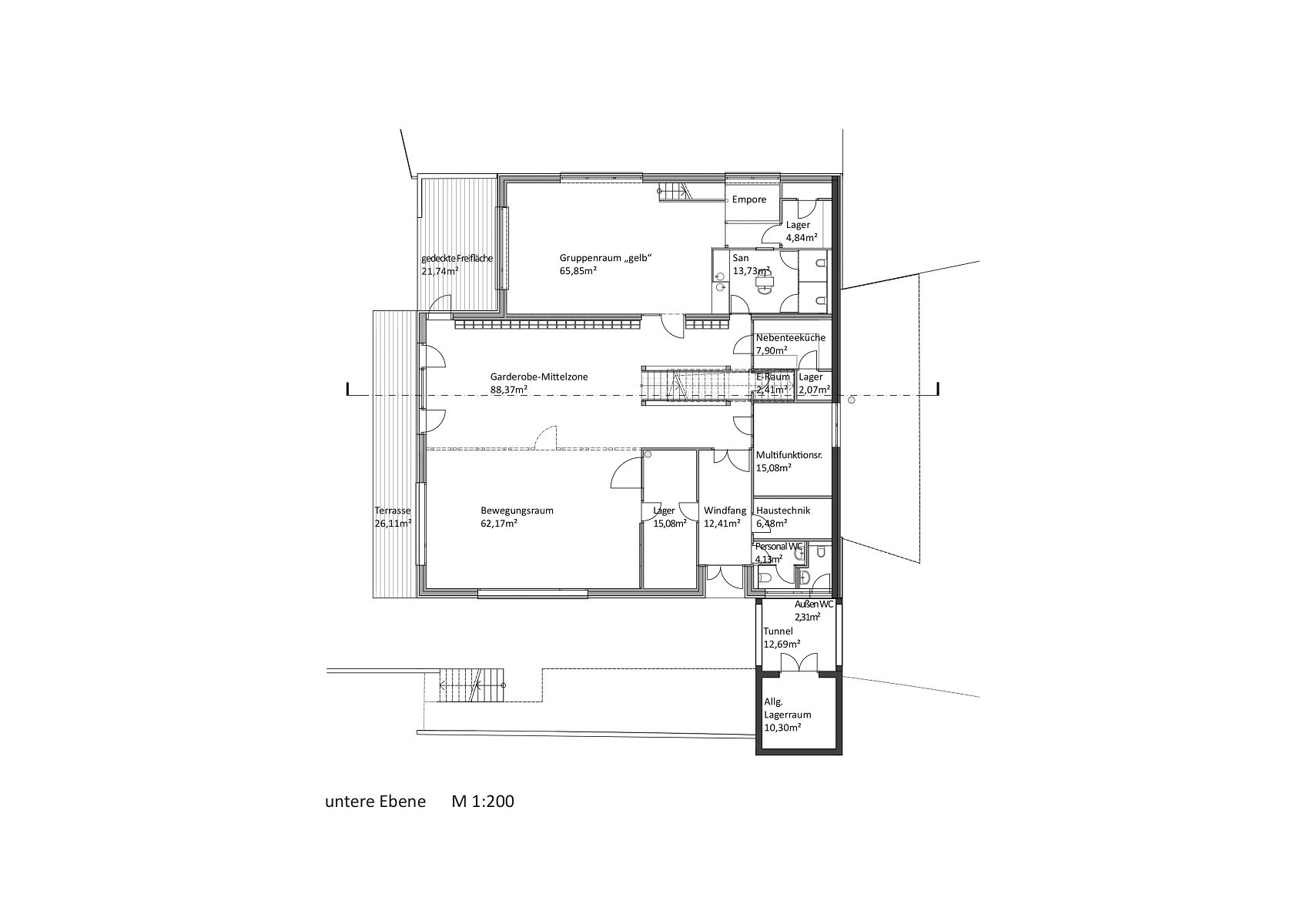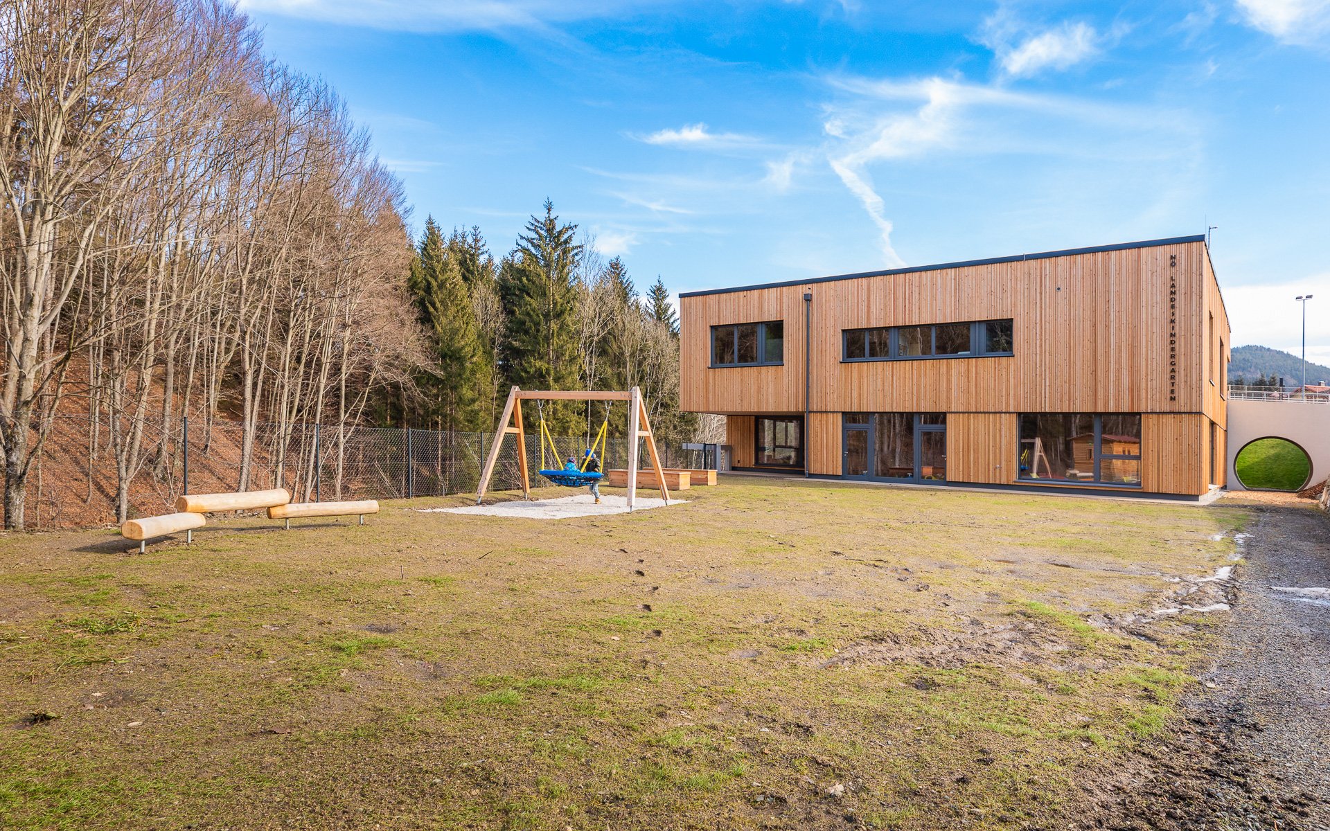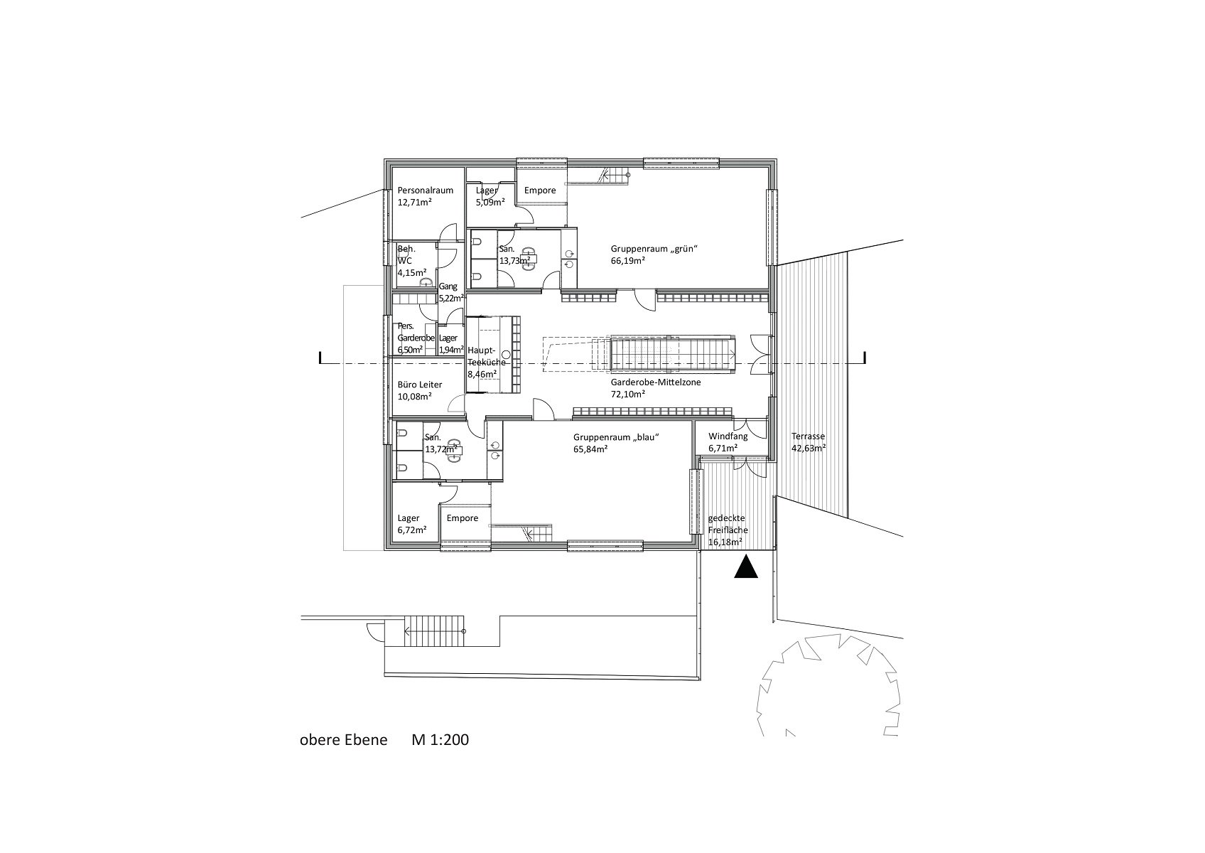 Die erdberührten Bauteile sind aus Stahlbeton, alle anderen Elemente sind konsequent aus sichtbaren Brettschichtholzplatten hergestellt. Es wurden 3 gleich breite Raumfelder von je 6m – mittig eine offene Treppe -drumherum die Garderoben mit Oberlicht ausgebildet. An den nicht auf Geländehöhe liegenden Gebäudeseiten werden linear die Nutzräume angeordnet. X Large Fenster und Glastüren/Elemente lassen den umgebenden Naturraum ins Innere + optimale innere Durchlässigkeit zu.