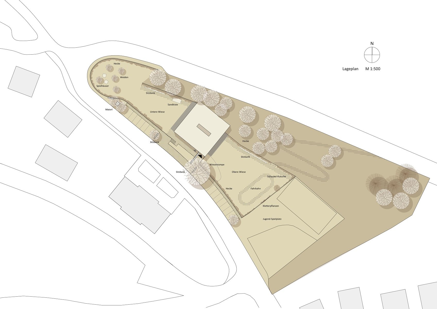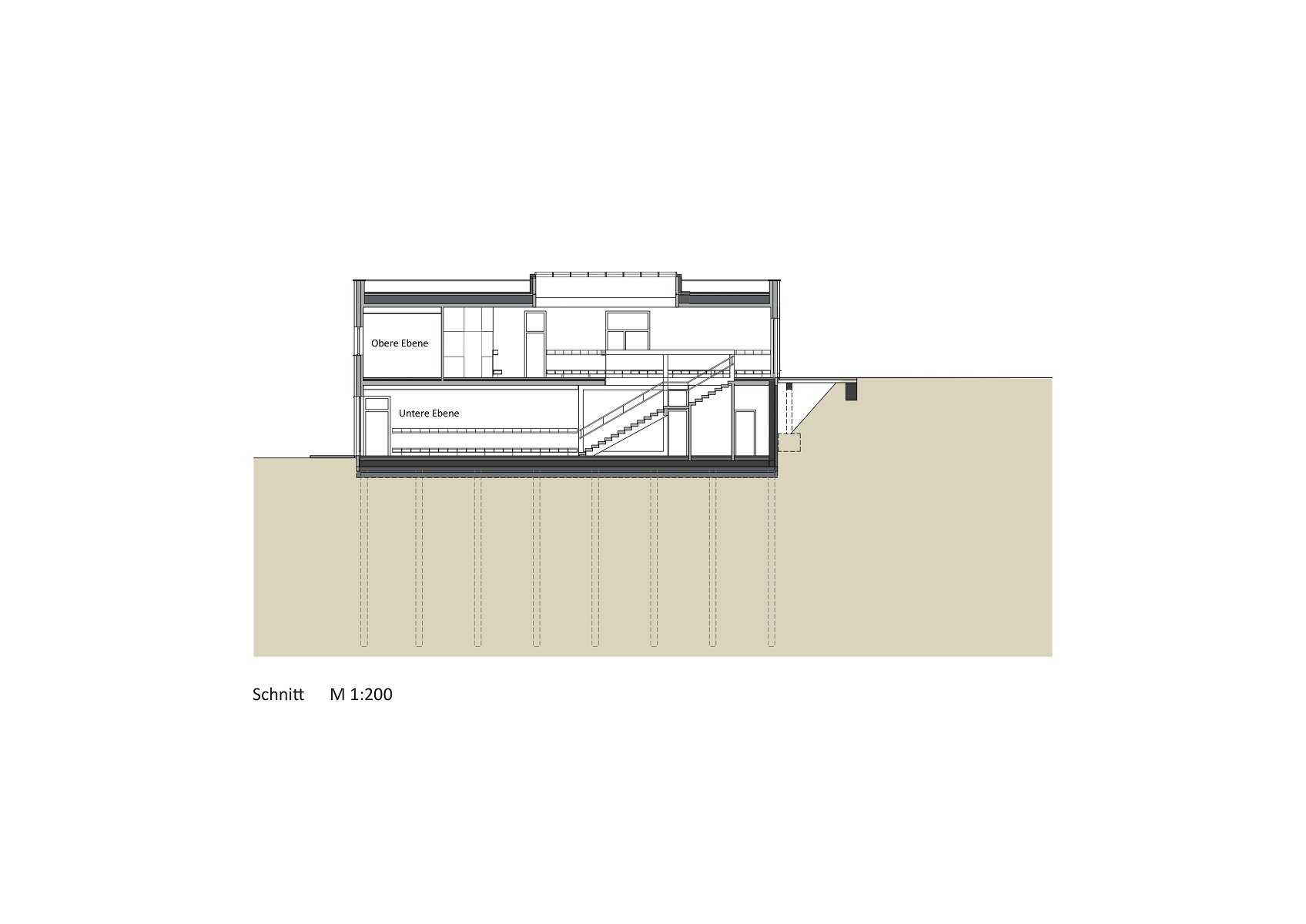 Der aus einem Wettbewerb hervorgegangene Entwurf setzt das würfelförmige Bauvolumen in die Hangkante und nimmt das Längs-Geländegefälle auf, indem der Gartenzugang um 1 Geschoß versetzt ist. Der Zugang erfolgt über eine Brücke. In den gegenüberliegenden Ecken definieren Ausnehmungen aus dem Baukörper die Ein- und Ausgänge.