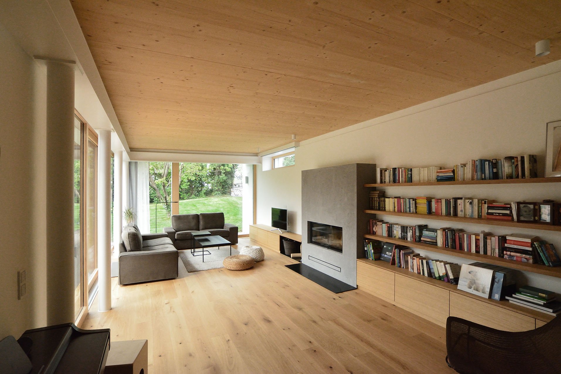 Durch die Sanierung der Gebäudehülle, die Aufstockung des eingeschossigen Gebäudeteils, eine Neugliederung im Inneren und den Neubau eines Gartenhauses sind alle Wünsche umgesetzt. Im Mittelpunkt stehen dabei der Bezug des Innenraums zum Garten und die Wahl warmer, offener Materialien.